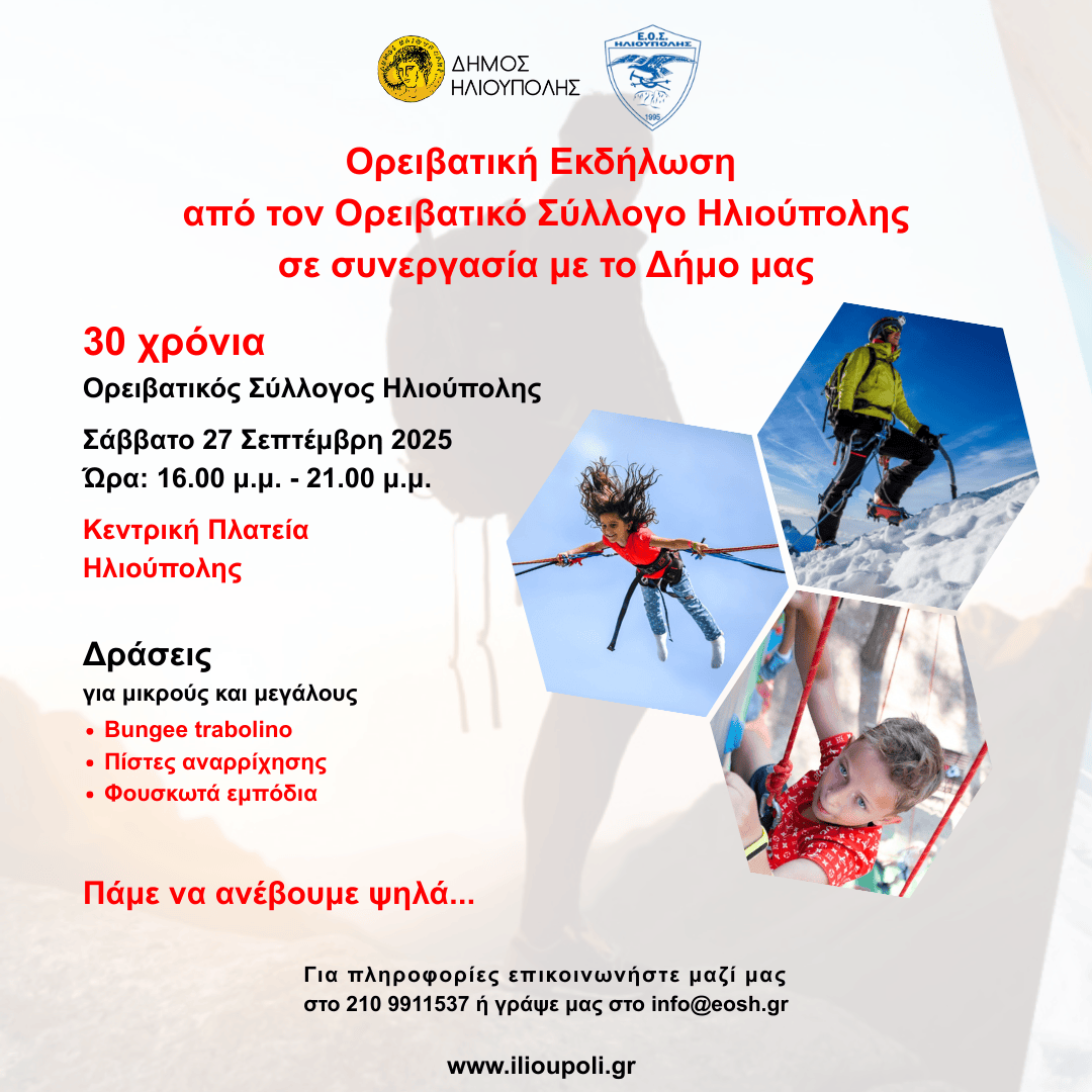 Ο Ορειβατικός Σύλλογος Ηλιούπολης γιορτάζει τα 30 χρόνια δράσης του, στα βουνά και στις ορεινές ομορφιές της Ελλάδας και του εξωτερικού, 30 χρόνια ανθρώπινης επαφής και δημιουργίας μοναδικών εμπειριών, με μία μοναδική εκδήλωση, σε συνεργασία με τον Δήμο.
