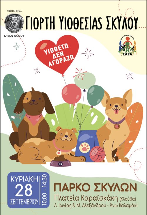 Την Κυριακή 28 Σεπτεμβρίου στο Άνω Καλαμάκι, το φιλοζωικό σωματείο ΣΑΖΑ διοργανώνει, υπό την αιγίδα του Δήμου Αλίμου, μία γιορτή υιοθεσίας σκύλου, από τις 10:00 έως τις 14:30, στο Πάρκο Σκύλων – Πλατεία Καραϊσκάκη (Κλούβα), Λ. Ιωνίας & Μ. Αλεξάνδρου.