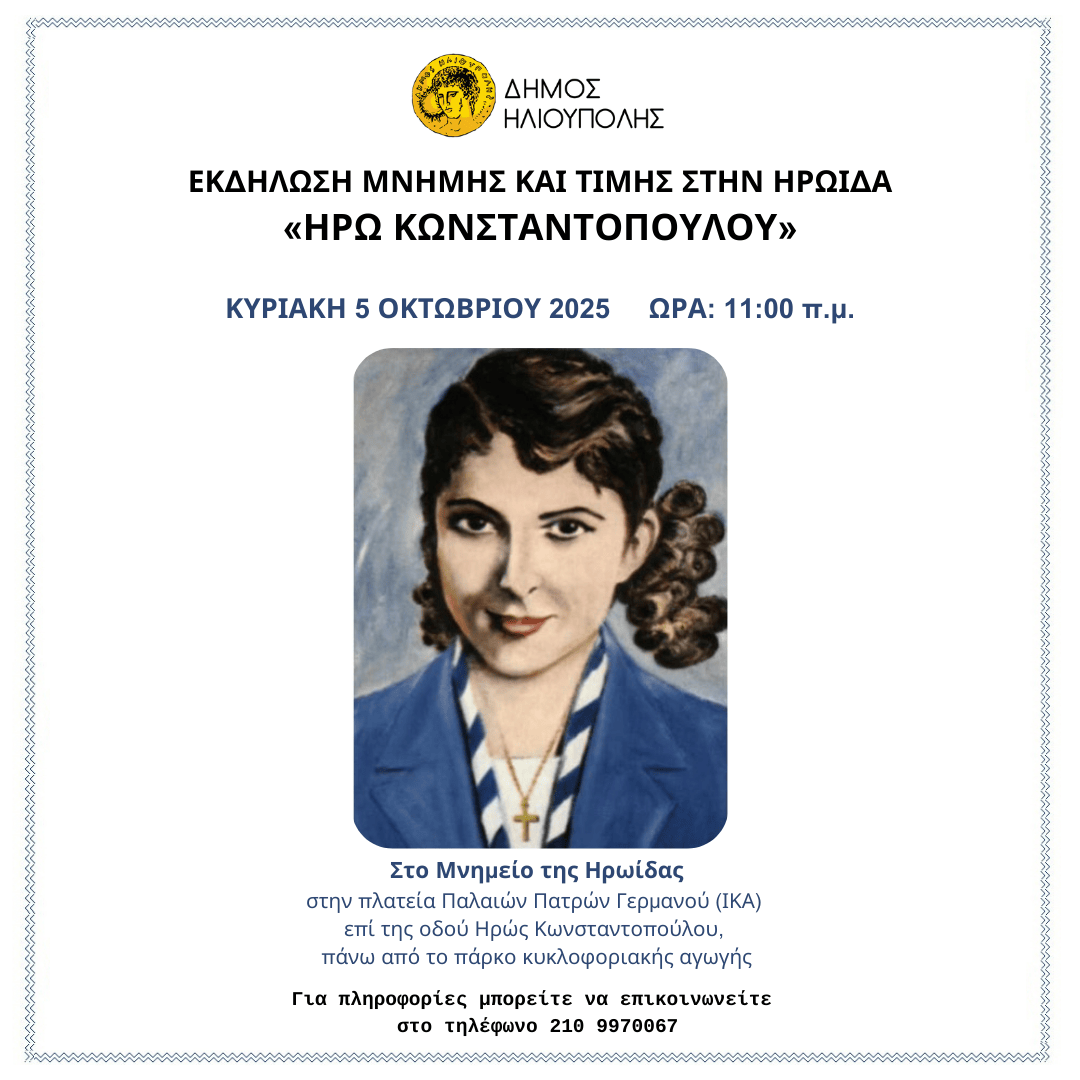 Ο Δήμος Ηλιούπολης διοργανώνει μία εκδήλωση μνήμης προς τιμήν της ΕΠΟΝίτισσας Ηρώς Κωνσταντοπούλου, την Κυριακή 5 Οκτωβρίου 2025 και ώρα 11:00 π.μ. στο Μνημείο της Ηρωίδας στην πλατεία Παλαιών Πατρών Γερμανού (ΙΚΑ), επί της οδού Ηρούς Κωνσταντοπούλου.