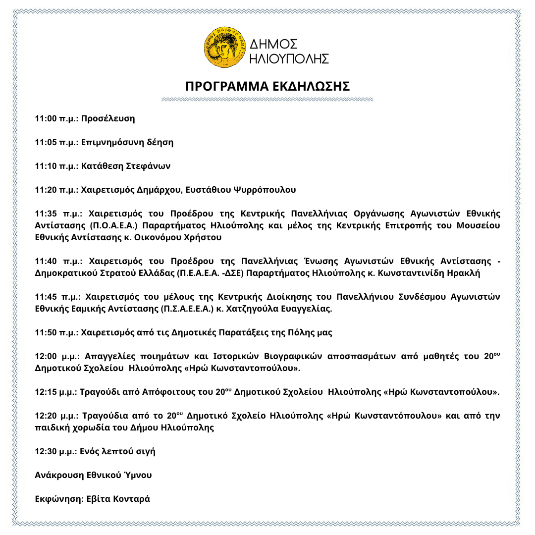 Η εκδήλωση θα περιλαμβάνει χαιρετισμούς αιρετών, κατάθεση στεφανιών, καθώς και απαγγελίες ποιημάτων και τραφουδιών.