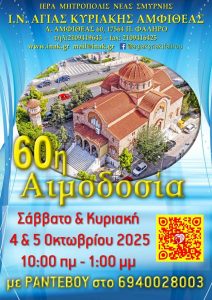 Ο Ιερός Ναός Αγίας Κυριακής που βρίσκεται στον Δήμο Παλαιού Φαλήρου, διοργανώνει την 60η Αιμοδοσία του, το πρώτο Σαββατοκύριακο του Οκτωβρίου.