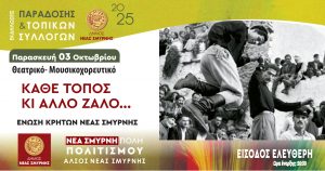 Στο πλαίσιο των εκδηλώσεων Παράδοσης & Τοπικών Συλλόγων που πραγματοποιούνται στις Ιωνικές Γιορτές 2025, του Δήμου Νέας Σμύρνης, θα πραγματοποιηθεί η μουσικοχορευτική παράσταση «Κάθε τόπος κι άλλο ζάλο» στο θέατρο Άλσους, που παρουσιάζει η Ένωση Κρητών Νέας Σμύρνης, την Παρασκευή 3 Οκτωβρίου.