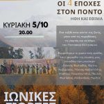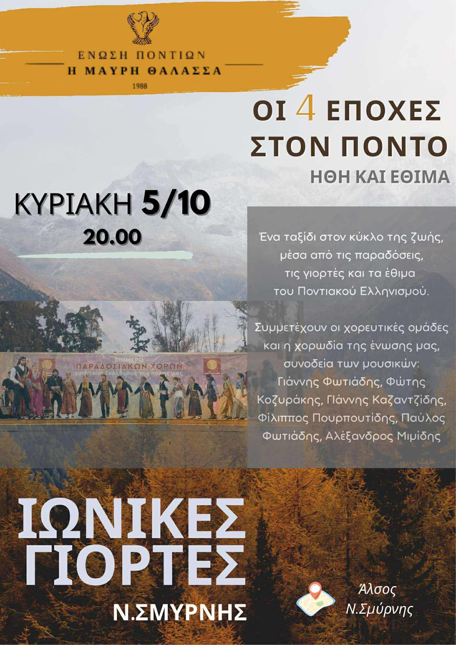 Το δεύτερο μέρος των Ιωνικών Γιορτών ολοκληρώνεται στον Δήμο Νέας Σμύρνης, την Κυριακή 5 Οκτωβρίου στο Άλσος Ν. Σμύρνης με εκδήλωση «Οι Τέσσερις εποχές στον Πόντο» από την Ένωση Ποντίων «Η Μαύρη Θάλασσα».
