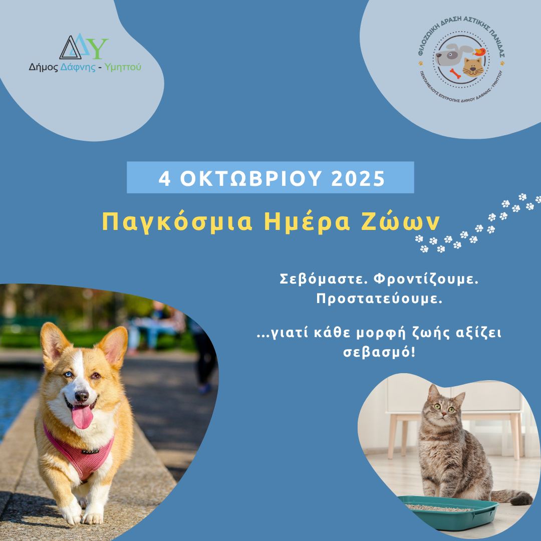 Ο Δήμος Δάφνης–Υμηττού τιμά την Παγκόσμια Ημέρα Ζώων, μέσα από το καθημερινό έργο που επιτελείται για τους τετράποδους φίλους, με περιθάλψεις, στειρώσεις και φροντίδα, προσφέροντάς τους αγάπη και προστασία.
