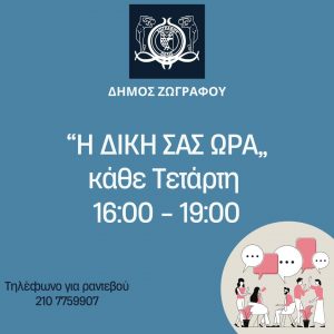 Από την Τετάρτη 8 Οκτωβρίου 2025 και κάθε Τετάρτη, από τις 16:00 έως τις 19:00, οι πολίτες του Δήμου Ζωγράφου μπορούν να συνομιλούν και να εκφράζουν τους προβληματισμούς τους από κοντά, μέσω της δράσης «Η δική σας ώρα».