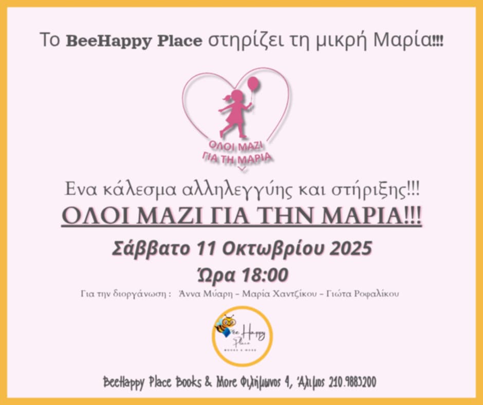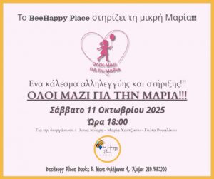 Στις 11 Οκτωβρίου 2025 στον Πολυχώρο του βιβλιοπωλείου BeeHappy Place Books & More (Φιλήμονος 4, Άλιμος) θα πραγματοποιηθεί φιλανθρωπική εκδήλωση με μπαζάρ ρούχων, μουσική και χορό για μικρούς και μεγάλους.