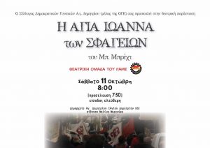 Ο Σύλλογος Δημοκρατικών Γυναικών (μέλος της ΟΓΕ), παρουσιάζει την θεατρική παράσταση «Η Αγία Ιωάννα των Σφαγείων» του Μπέρτολτ Μπρέχτ, από την θεατρική ομάδα του ΠΑΜΕ.