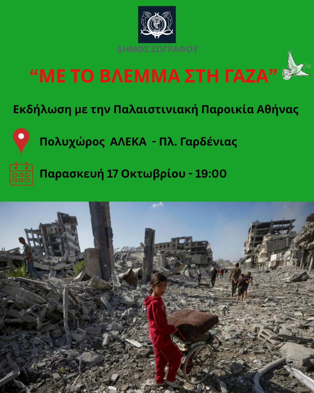Μία εκδήλωσε με θέμα «Με το βλέμμα στην Γάζα» που διοργανώνει ο Δήμος Ζωγράφου σε συνεργασία με την Παροικία των Παλαιστινίων της Αθήνας.