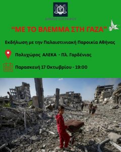 Μία εκδήλωσε με θέμα «Με το βλέμμα στην Γάζα» που διοργανώνει ο Δήμος Ζωγράφου σε συνεργασία με την Παροικία των Παλαιστινίων της Αθήνας.