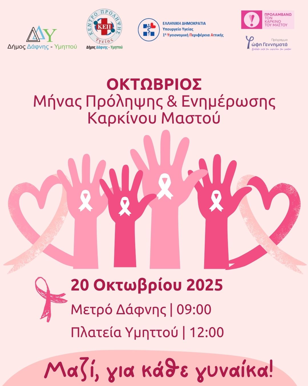 Με αφορμή την Παγκόσμια Ημέρα Πρόληψης για τον Καρκίνο του Μαστού (25 Οκτωβρίου 2025), το ΚΕΠ Υγείας Δάφνης-Υμηττού, σε συνεργασία με το Κέντρο Υγείας Δάφνης (1η ΥΠΕ), διοργανώνουν δράση ενημέρωσης και ευαισθητοποίησης για την πρόληψη του Καρκίνου του Μαστού, στο πλαίσιο του προγράμματος «ΠΡΟΛΑΜΒΑΝΩ», τη Δευτέρα 20 Οκτωβρίου.