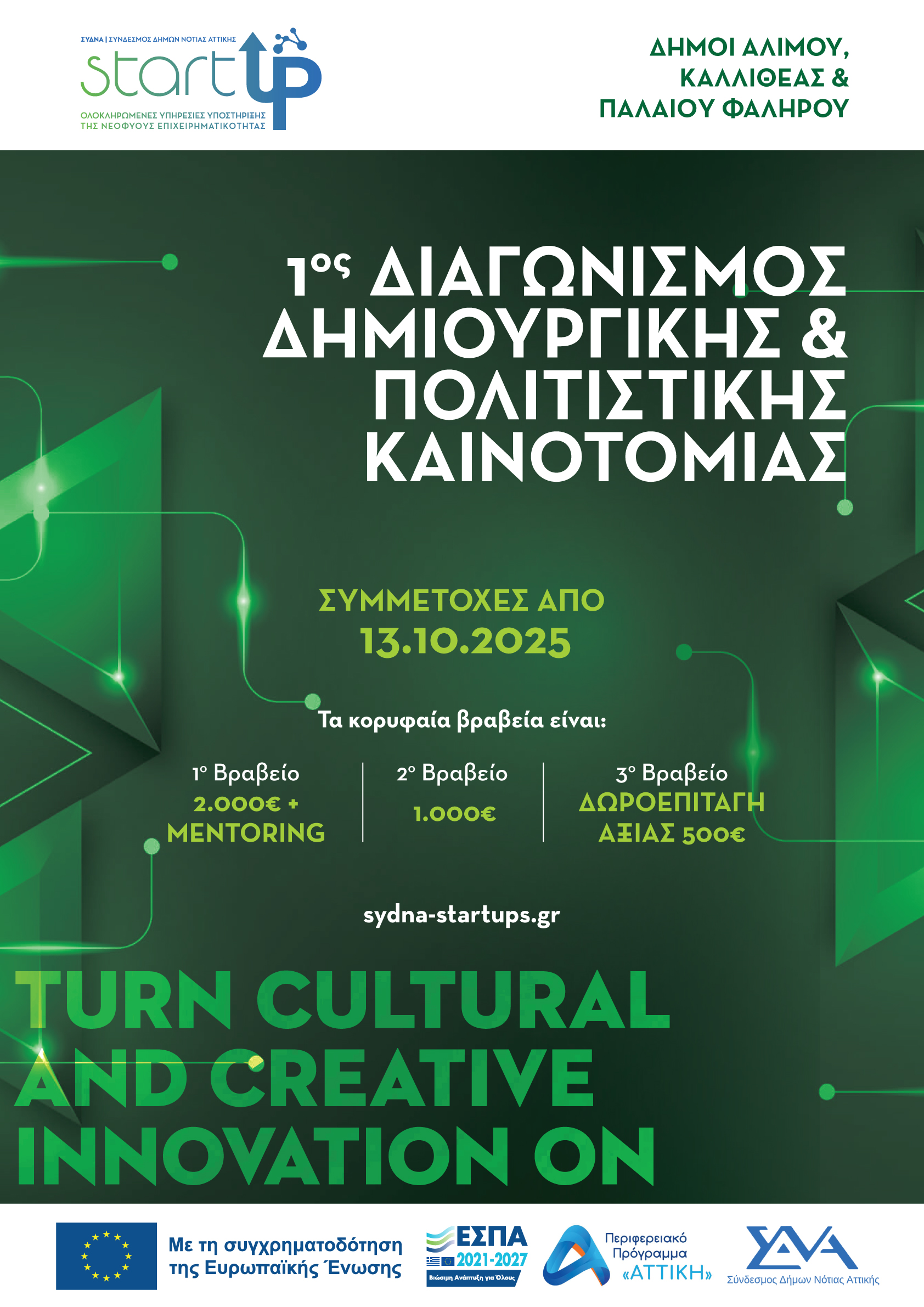 Ο Σύνδεσμος Δήμων Νότιας Αττικής (ΣυΔΝΑ) και η δράση υποστήριξης Νεοφυούς Επιχειρηματικότητας Sydna-Startups διοργανώνουν τον 1ο Διαγωνισμό Δημιουργικής & Πολιτιστικής Καινοτομίας o οποίος αποτελεί μια πρωτοποριακή δράση για την περιοχή και θέτει ως βασικούς άξονες τη σύνδεση της Νεοφυούς Επιχειρηματικότητας με την πολιτιστική δημιουργία, την τεχνολογία και την καινοτομία.