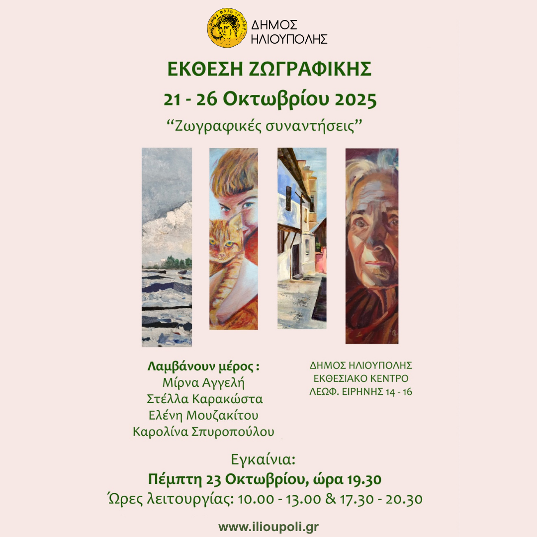 O Δήμος Ηλιούπολης έχει την τιμή φιλοξενήσει μία ακόμη έκθεση ζωγραφικής στο Εκθεσιακό Κέντρο του Δήμου, με τίτλο «Ζωγραφικές Συναντήσεις».