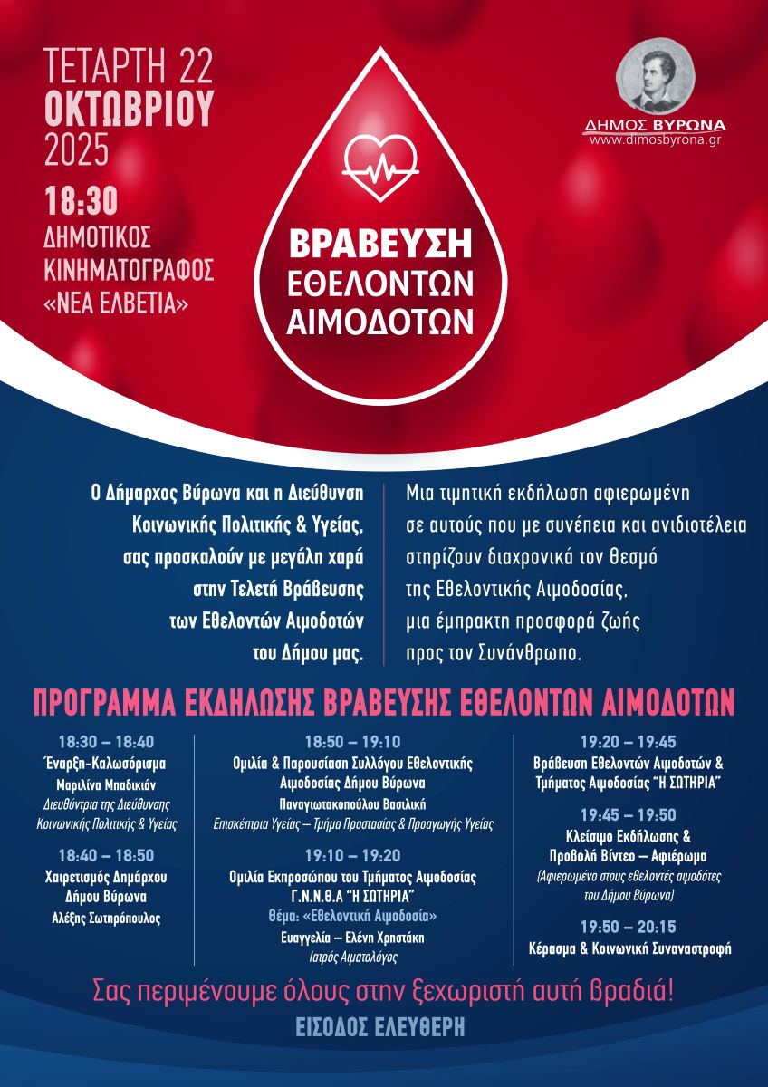 Ο Δήμος Βύρωνα διοργανώνει μία τιμητική εκδήλωση αφιερωμένη στους εθελοντές αιμοδότες, που με συνέπεια και ανιδιοτέλεια στηρίζουν διαχρονικά τον θεσμό της εθελοντικής αιμοδοσίας στην πόλη.