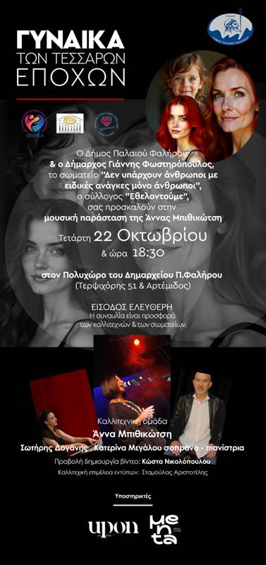 Ο Δήμος Παλαιού Φαλήρου, το Σωματείο «Δεν υπάρχουν άνθρωποι με ειδικές ανάγκες μόνο άνθρωποι» και ο Σύλλογος «Εθελοντούμε», διοργανώνουν μία μουσική παράσταση συμπερίληψης, με την Άννα Μπιθικώτση.