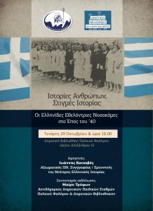 Με αφορμή την επέτειο του Έπους του ’40, η Δημοτική Βιβλιοθήκη Παλαιού Φαλήρου διοργανώνει εκδήλωση τιμής για τις Ελληνίδες Εθελόντριες Νοσοκόμους, που με αυταπάρνηση, ανθρωπιά και ανιδιοτελή προσφορά στήριξαν τη χώρα σε κρίσιμες στιγμές της χώρας.