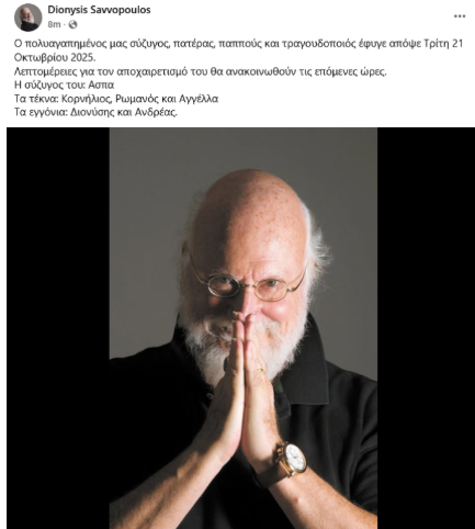 Ο πολυαγαπημένος μας σύζυγος, πατέρας, παππούς και τραγουδοποιός έφυγε απόψε Τρίτη 21 Οκτωβρίου 2025.