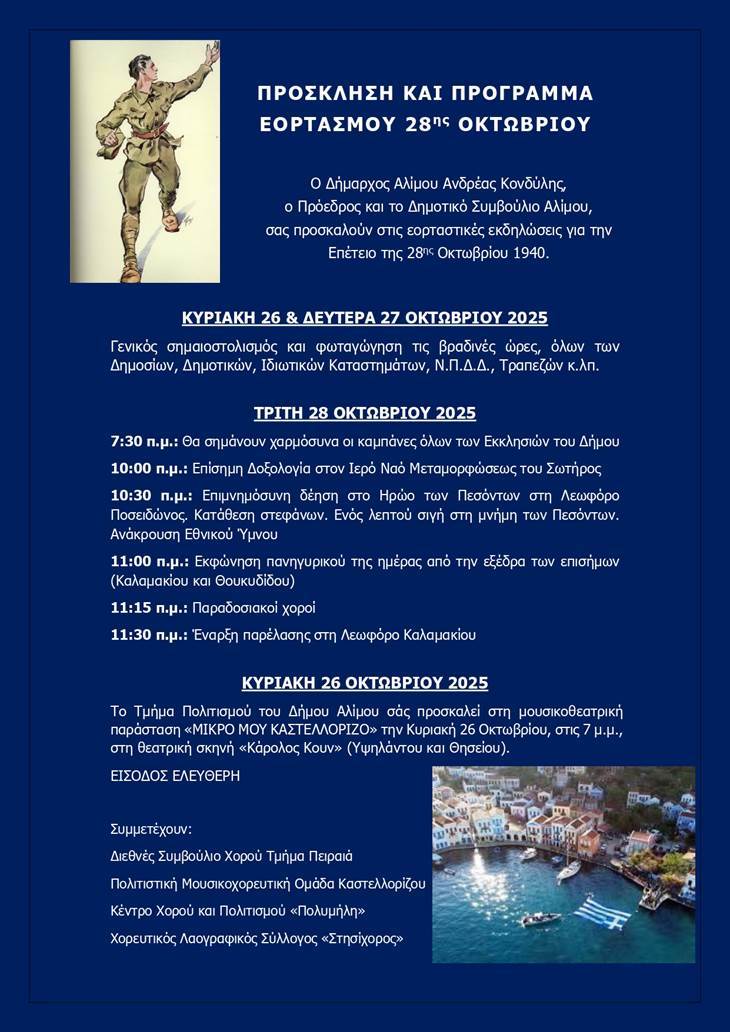 Ο Δήμος Αλίμου τιμά την εθνική επέτειο της 28ης Οκτωβρίου 1940, με πληθώρα εορταστικών εκδηλώσεων. Ο δήμαρχος Αλίμου, Ανδρέας Κονδύλης και το Δημοτικό Συμβούλιο καλούν κάθε δημότη και κάτοικο να συμμετέχει, δείχνοντας τιμή και σεβασμό στον αγώνα χιλιάδων Ελλήνων.