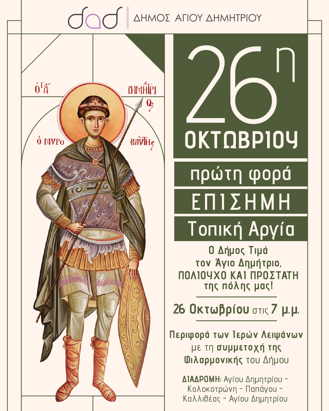Όπως τόνισε ο δήμαρχος Αγίου Δημητρίου, Στέλιος Μαμαλάκης: «Ύστερα από επίμονη προσπάθεια, υπεγράφη το καλοκαίρι το Προεδρικό Διάταγμα που καθιερώνει επισήμως την 26η Οκτωβρίου, ημέρα εορτής του Αγίου Δημητρίου του Μυροβλήτου, πολιούχου της πόλης μας, ως τοπική ημέρα Αργίας για τον Δήμο μας! Στο εξής στις 26 Οκτωβρίου, οι δημόσιες υπηρεσίες και τα σχολεία του Δήμου θα παραμένουν κλειστά, ώστε όλοι να μπορούμε να συμμετέχουμε στις εκδηλώσεις εορτασμού του Αγίου μας με την λαμπρότητα που του αξίζει!»