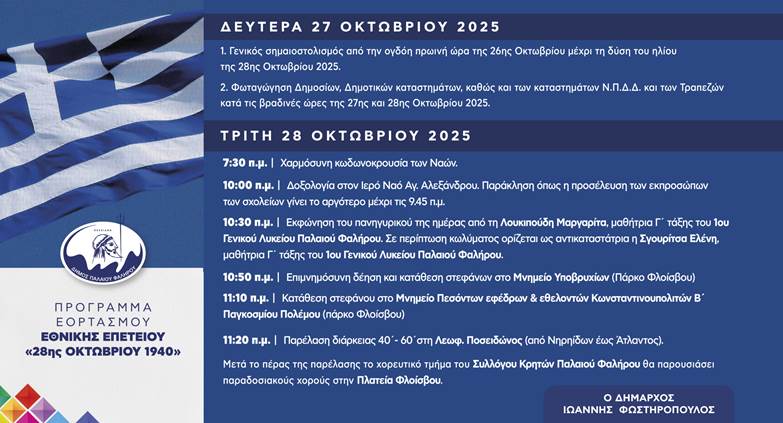 Ο Δήμος Παλαιού Φαλήρου τιμά την Εθνική Επέτειο της 28ης Οκτωβρίου 1940, με μία σειρά εορταστικών εκδηλώσεων την πόλη.