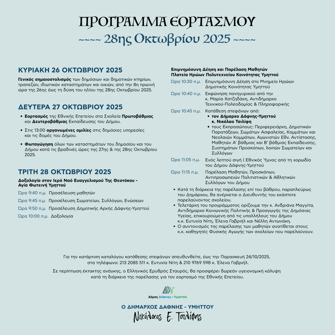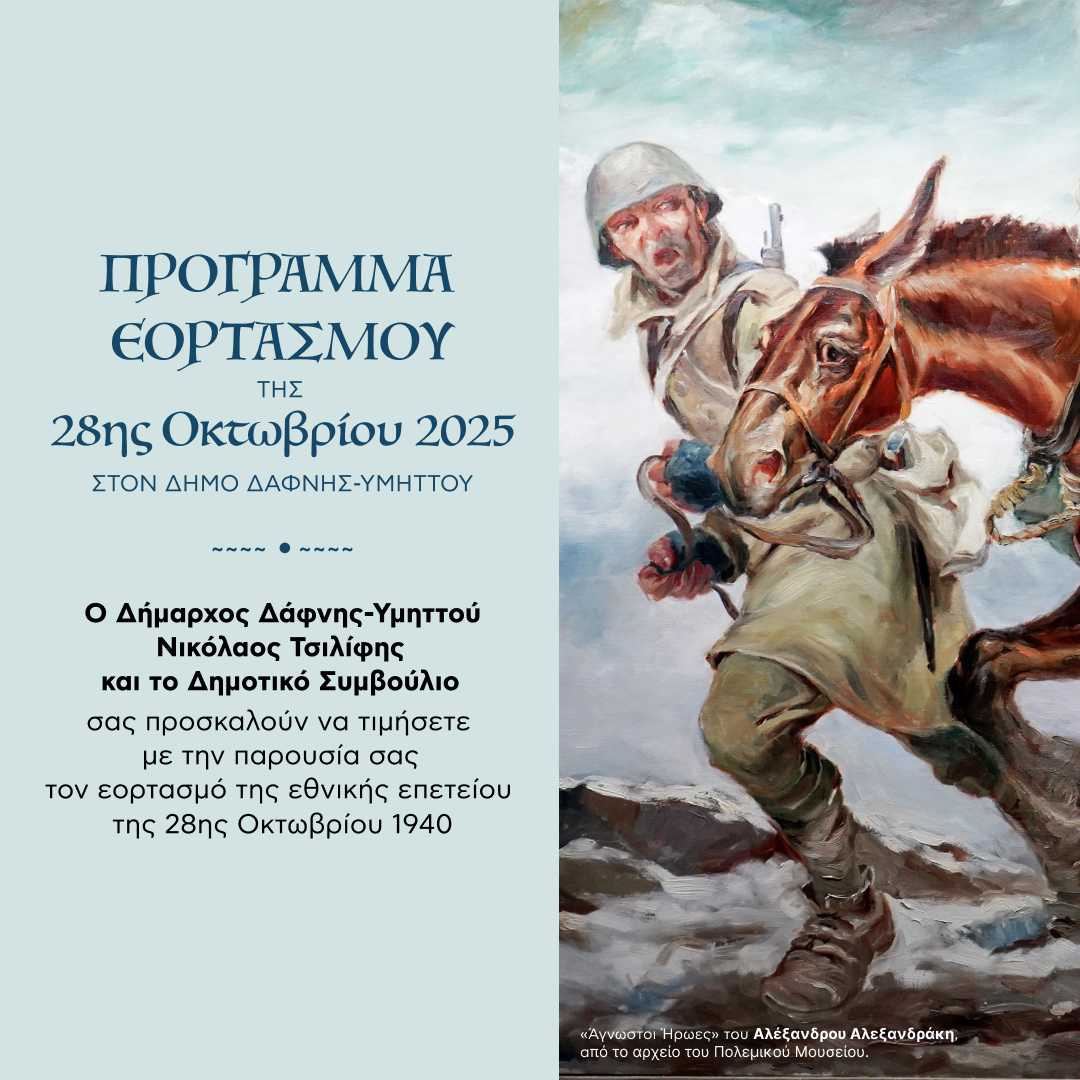 Ο Δήμος Δάφνης-Υμηττού ανακοίνωσε το ο πρόγραμμα των εορταστικών εκδηλώσεων για την εθνική επέτειο της 28ης Οκτωβρίου 1940, που θα πραγματοποιηθεί στη δημοτική κοινότητα Υμηττού.