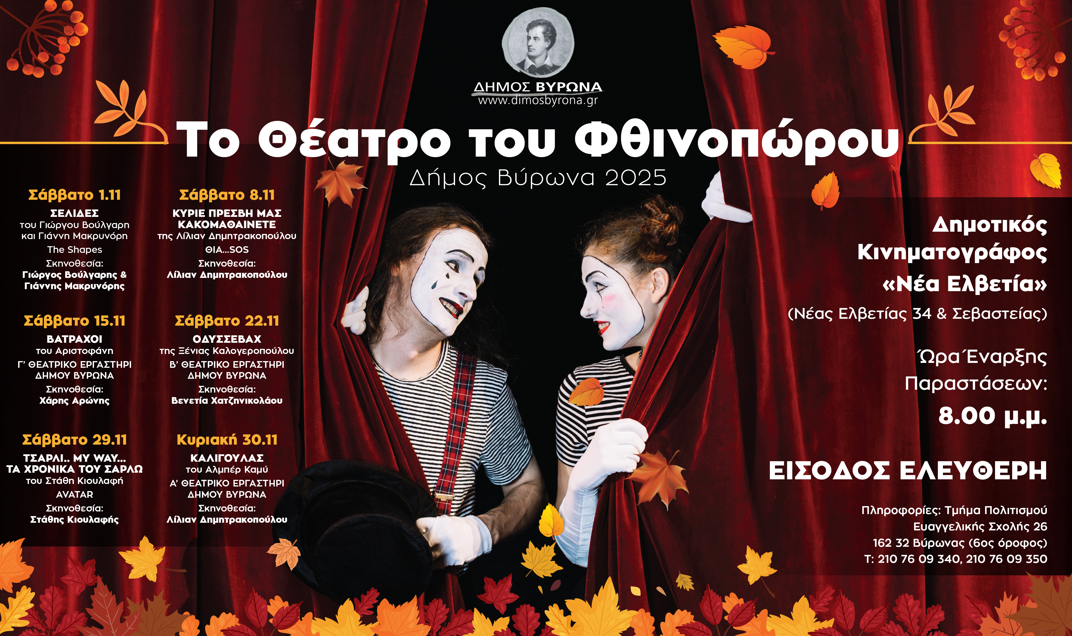 Ο Δήμος Βύρωνα καλωσορίζει «Το Θέατρο του Φθινοπώρου», ένα πολιτιστικό γεγονός που επαναφέρει στη σκηνή του Δημοτικού Κινηματογράφου «Νέα Ελβετία» τη μαγεία του θεάτρου και τη ζωντάνια της συλλογικής δημιουργίας.