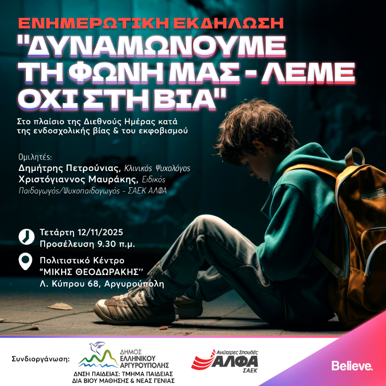 Στο πλαίσιο της Παγκόσμιας Ημέρας κατά της Βίας και του Εκφοβισμού στο Σχολείο, ο Δήμος Ελληνικού – Αργυρούπολης, διοργανώνει μία ενημερωτική εκδήλωση για τους μαθητές της πόλης, με τίτλο «Δυναμώνουμε τη Φωνή μας – Λέμε Όχι στη Βία», μέσω της Διεύθυνσης Παιδείας και του Τμήματος Παιδείας, Δια Βίου Μάθησης & Νέας Γενιάς και σε συνεργασία με τη ΣΑΕΚ ΑΛΦΑ.