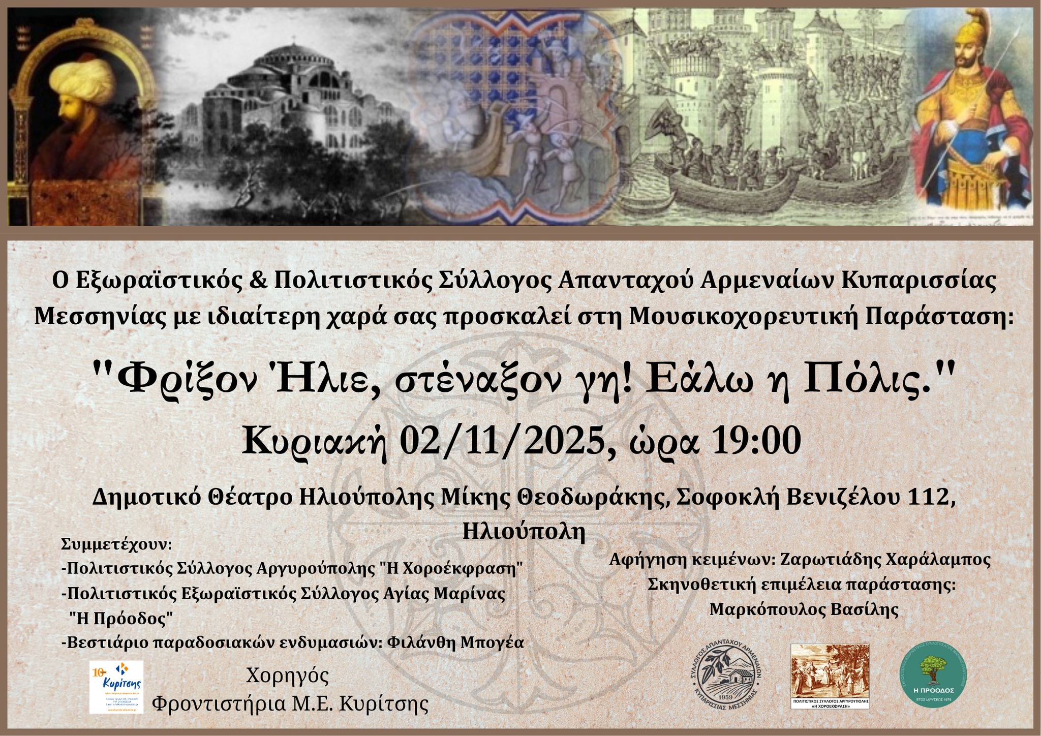 Ο Εξωραϊστικός & Πολιτιστικός Σύλλογος Απανταχού Αρμεναίων Κυπαρισσίας Μεσσηνίας διοργανώνει μία μουσικοχορευτική παράσταση, που φέρει τον τίτλο «Φρίξον ‘Ηλιε, στέναξον γη! Εάλω η Πόλις», προς τιμήν της ίδρυσης και Άλωσης της Κωνσταντινούπολης.