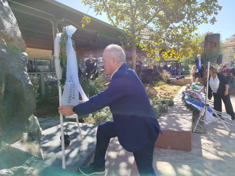 Ακολούθησαν καταθέσεις στεφάνων από τον Δήμαρχο, εκ μέρους του Περιφερειάρχη Αττικής από την εντεταλμένη σύμβουλο Δήμητρα Αγγελάκη, τους επικεφαλής των δημοτικών παρατάξεων, εκπροσώπους κομμάτων και μαζικών φορέων της πόλης. Μετά την τήρηση ενός λεπτού σιγής, τον Εθνικό Ύμνο έψαλλε η χορωδία των ΚΑΠΗ υπό τη διεύθυνση της Δώρας Ζαμπέλη.