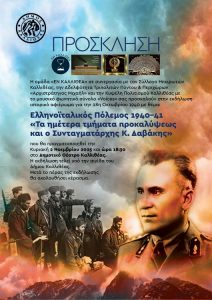 Η ομάδα «Εν Καλλιθέα» σε συνεργασία με τον Σύλλογο Ηπειρωτών Καλλιθέας, την Αδελφότητα Τριπολιτών Πόντου & Περιχώρων «Αρχιστράτηγος Μιχαήλ» και την Κυψέλη Πολιτισμού Καλλιθέας με το μουσικό φωνητικό σύνολο «Voices» διοργανώνουν ένα ιστορικό αφιέρωμα για την 28η Οκτωβρίου 1940 με θέμα: «Ελληνοϊταλικός Πόλεμος 1940-41: Τα ημέτερα τμήματα προκαλύψεως και ο Συνταγματάρχης Κ. Δαβάκης».