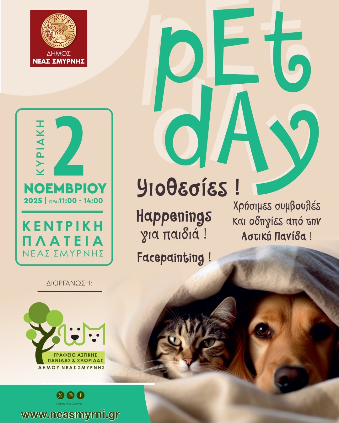 Η Αστική Πανίδα του Δήμου Νέας Σμύρνης διοργανώνει την Κυριακή 2 Νοεμβρίου 2025 μία εκδήλωση – γιορτή δημιουργικής ενημέρωσης, υιοθεσίας και χαράς με πρωταγωνιστές τα τετράποδα φιλαράκια της.