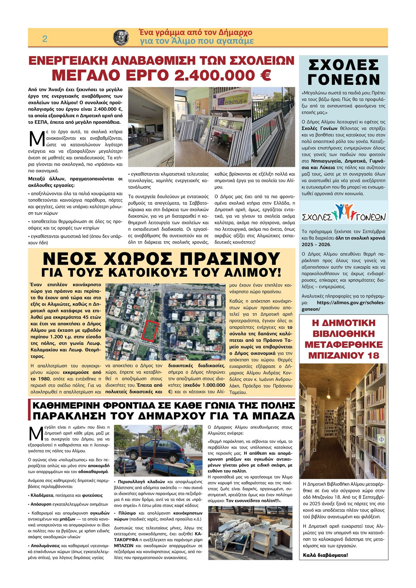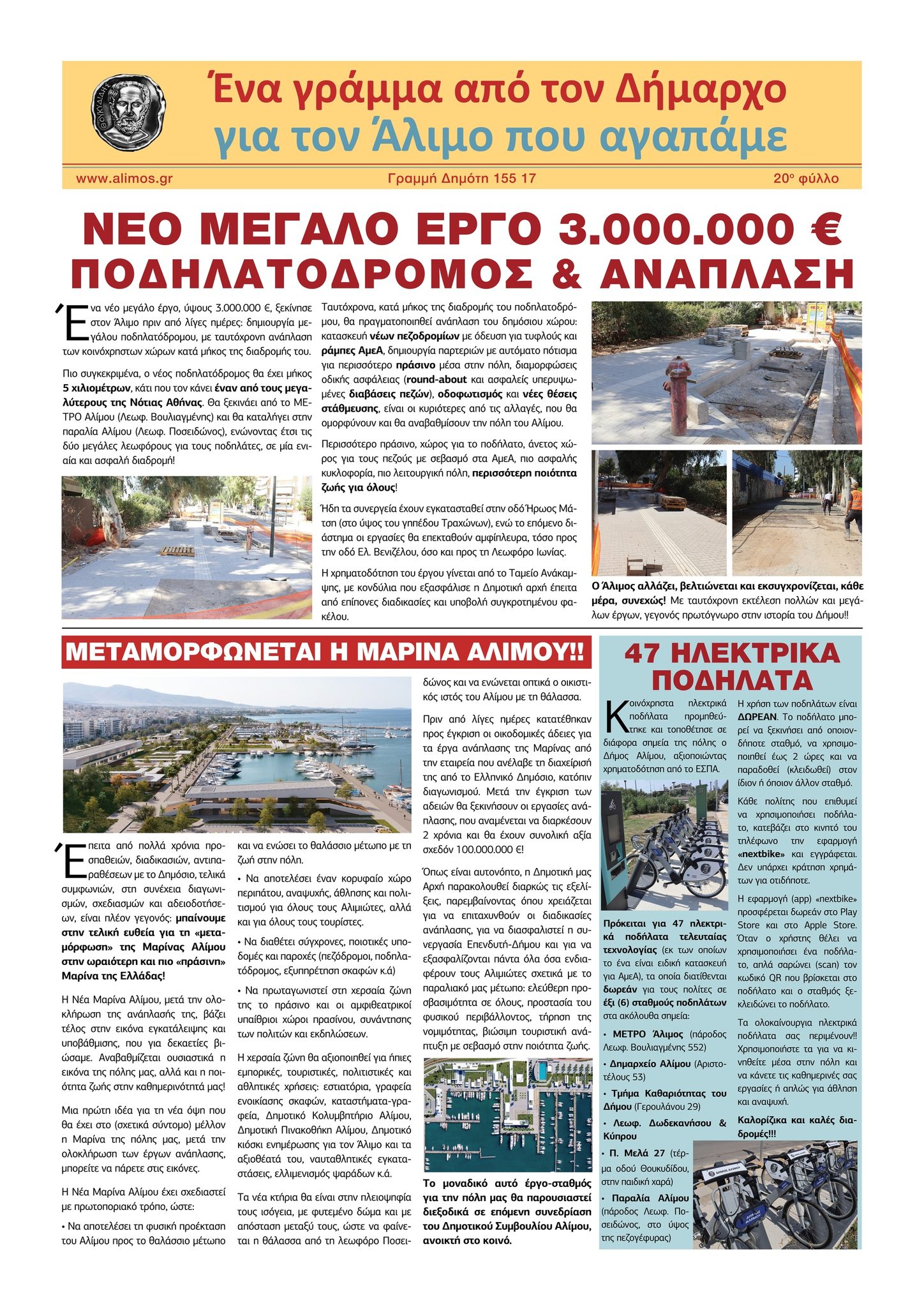 Στο «Γράμμα», που είναι το 20ο κατά σειρά, οι δημότες θα βρουν αναλυτικές πληροφορίες για τα πολλά και μεγάλα έργα που είναι σε εξέλιξη στον Άλιμο, όπως: