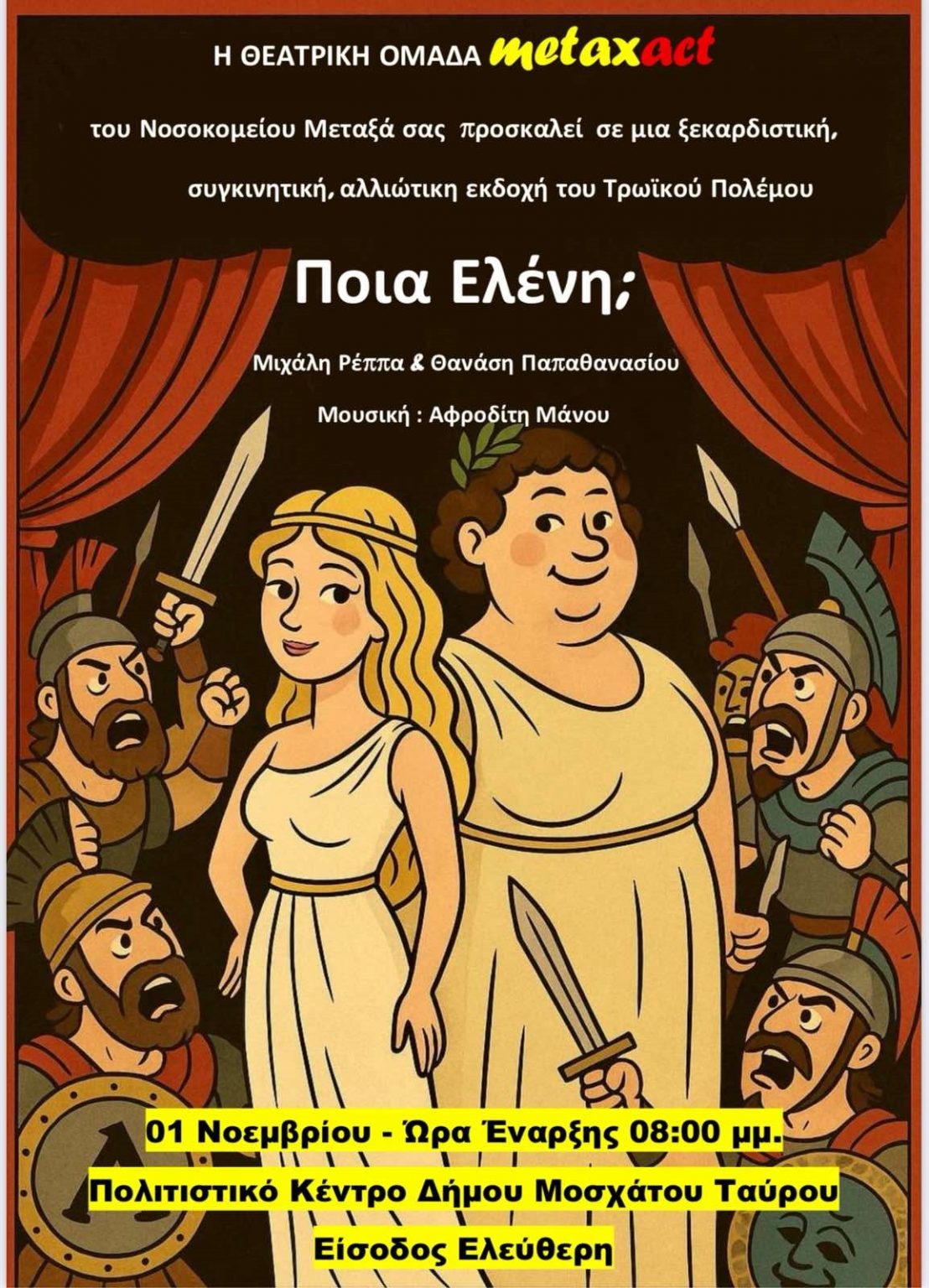 Ο Δήμος Μοσχάτου-Ταύρου φιλοξενεί μια ξεκαρδιστική, συγκινητική, αλλιώτικη εκδοχή του Τρωικού Πολέμου, από τη θεατρική ομάδα Μataxact, με τίτλο «Ποια Ελένη;».
