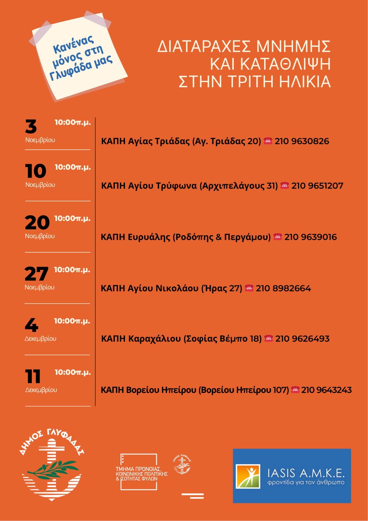 Ο Δήμος Γλυφάδας (Τμήμα Πρόνοιας, Κοινωνικής Πολιτικής και Ισότητας των Φύλων) με πρωτοβουλία του δημάρχου Γιώργου Παπανικολάου και σε συνεργασία με το Κέντρο Ημέρας IASIS Γλυφάδας της IASIS AMKE, πραγματοποιεί ενημερωτικές ημερίδες για την πρόληψη των διαταραχών μνήμης και της κατάθλιψης που βιώνουν εκατομμύρια συνάνθρωποί σε όλο τον κόσμο και οι οικογένειές τους.