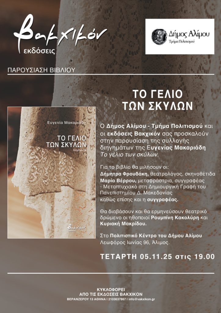 Ο Δήμος Αλίμου, Τμήμα Πολιτισμού και οι Εκδόσεις Βακχικόν διοργανώνουν την παρουσίαση της συλλογής διηγημάτων της Ευγενίας Μακαριάδη «Το γέλιο των σκύλων», από τις Εκδόσεις Βακχικόν, την Τετάρτη 5 Νοεμβρίου, στις 19.00, στο Πολιτιστικό Κέντρο του Δήμου Αλίμου (Λεωφόρος Ιωνίας 96, Άλιμος).