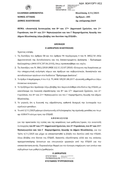 Δείτε παρακάτω αναλυτικά την απόφαση του δημάρχου Ηλιούπολης: