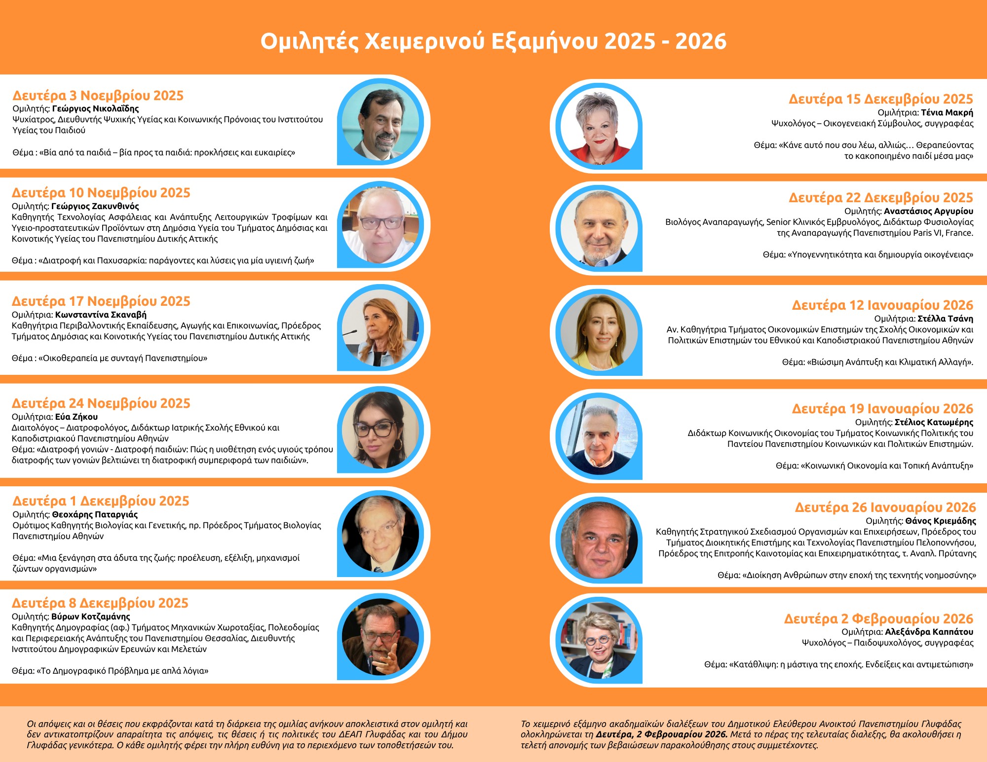 «Το χειμερινό εξάµηνο 2025-26 στο Δημοτικό Ελεύθερο Ανοικτό Πανεπιστήμιο Γλυφάδας ξεκίνησε! Με ευρύ φάσµα γνωστικών αντικειµένων. Με διαπρεπείς επιστήµονες που συµµετέχουν αφιλοκερδώς. Με ενθουσιασµό από πλευράς της δηµοτικής µας αρχής. Κυρίως, όµως, µε το δικό σας ενδιαφέρον και την επιθυµία σας να αντλείτε συνεχώς νέες γνώσεις και να αξιοποιείτε µε τον καλύτερο δυνατό τρόπο τον ελεύθερο χρόνο σας.