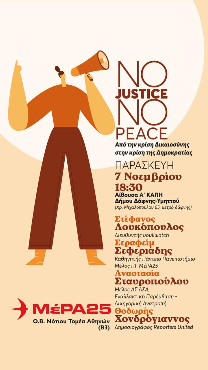 Ο Νότιος Τομέας Αθηνών του ΜΕΡΑ25 διοργανώνει μια εκδήλωση-συζήτηση με έγκριτους νομικούς και ακαδημαϊκούς με θέμα «Από την κρίση Δικαιοσύνης στην κρίση Δημοκρατίας», με σύνθημα το «No Justice – No Peace!».