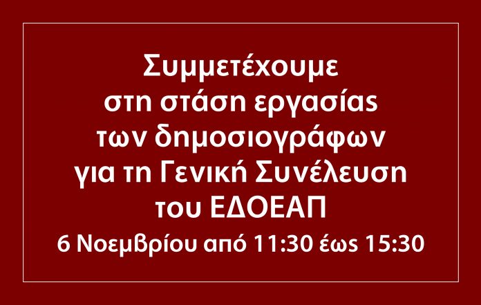 «Το Διοικητικό Συμβούλιο της ΠΟΕΣΥ αποφάσισε την προκήρυξη τετράωρης στάσης εργασίας την Πέμπτη 6 Νοεμβρίου 2025 από τις 11:30 π.μ. έως 3:30 μ.μ. για όλους τους δημοσιογράφους – μέλη των Ενώσεων Μελών της ΠΟΕΣΥ, που εργάζονται σε όλα τα Μέσα Μαζικής Ενημέρωσης και είναι ασφαλισμένοι στον «ΕΝΙΑΙΟ ΔΗΜΟΣΙΟΓΡΑΦΙΚΟ ΟΡΓΑΝΙΣΜΟ ΕΠΙΚΟΥΡΙΚΗΣ ΑΣΦΑΛΙΣΕΩΣ ΚΑΙ ΠΕΡΙΘΑΛΨΕΩΣ» (ΕΔΟΕΑΠ), προκειμένου να διευκολυνθεί η συμμετοχή τους στην Τακτική Γενική Συνέλευση του Ασφαλιστικού τους φορέα».