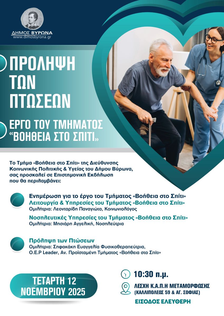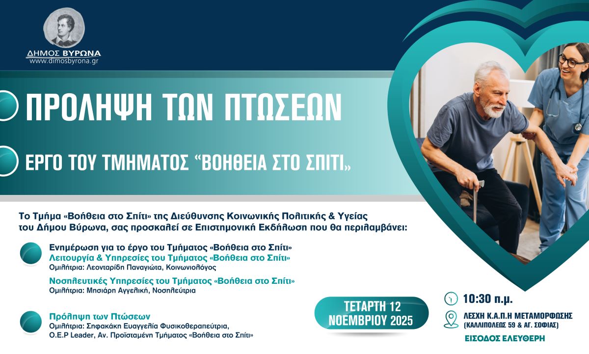Ο Δήμος Βύρωνα, και το Τμήμα «Βοήθεια στο Σπίτι» της Διεύθυνσης Κοινωνικής Πολιτικής & Υγείας, διοργανώνει μια σημαντική επιστημονική εκδήλωση αφιερωμένη στην προαγωγή της υγείας, της πρόληψης και της ενεργού γήρανσης.