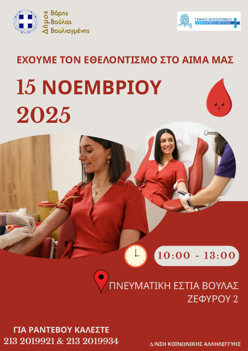 Με γνώμονα όλα τα παραπάνω, ο Δήμος Βάρης-Βούλας-Βουλιαγμένης διοργανώνει το Σάββατο 15 Νοεμβρίου, από τις 10:00 έως τη 13:00, εθελοντική αιμοδοσία στην Πνευματική Εστία Βούλας (Ζεφύρου 2, Βούλα), κατόπιν ραντεβού.
