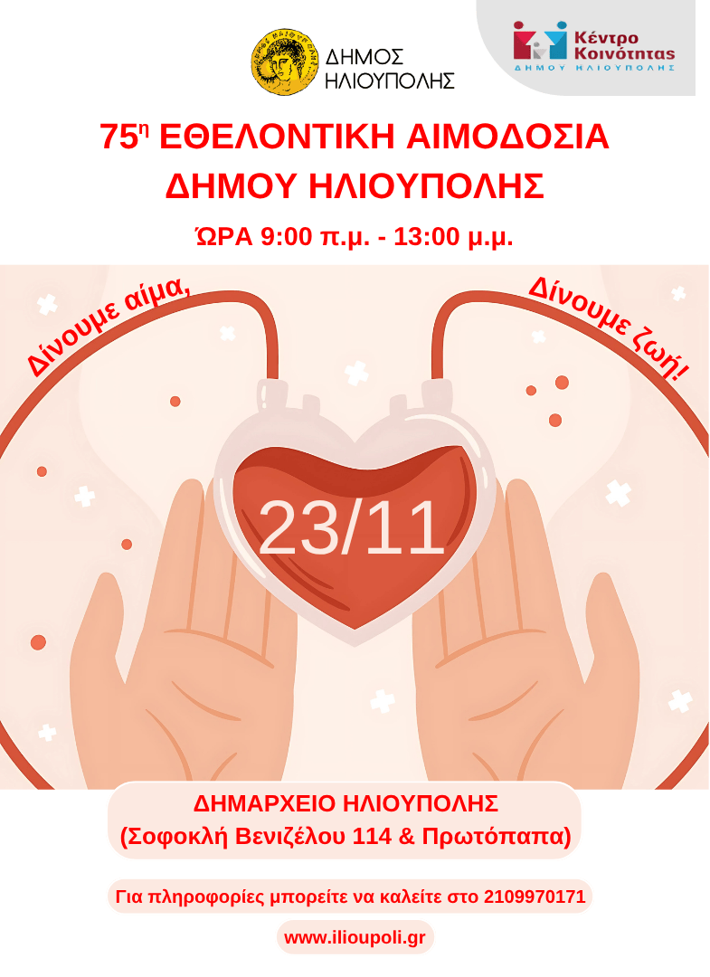 Η εθελοντική αιμοδοσία θα πραγματοποιηθεί στο Δημαρχείο της Ηλιούπολης (Σοφοκλή Βενιζέλου 114 & Πρωτόπαπα), την Κυριακή 23 Νοεμβρίου 2025 και ώρες 09.00 π.μ. έως 13.00 μ.μ..