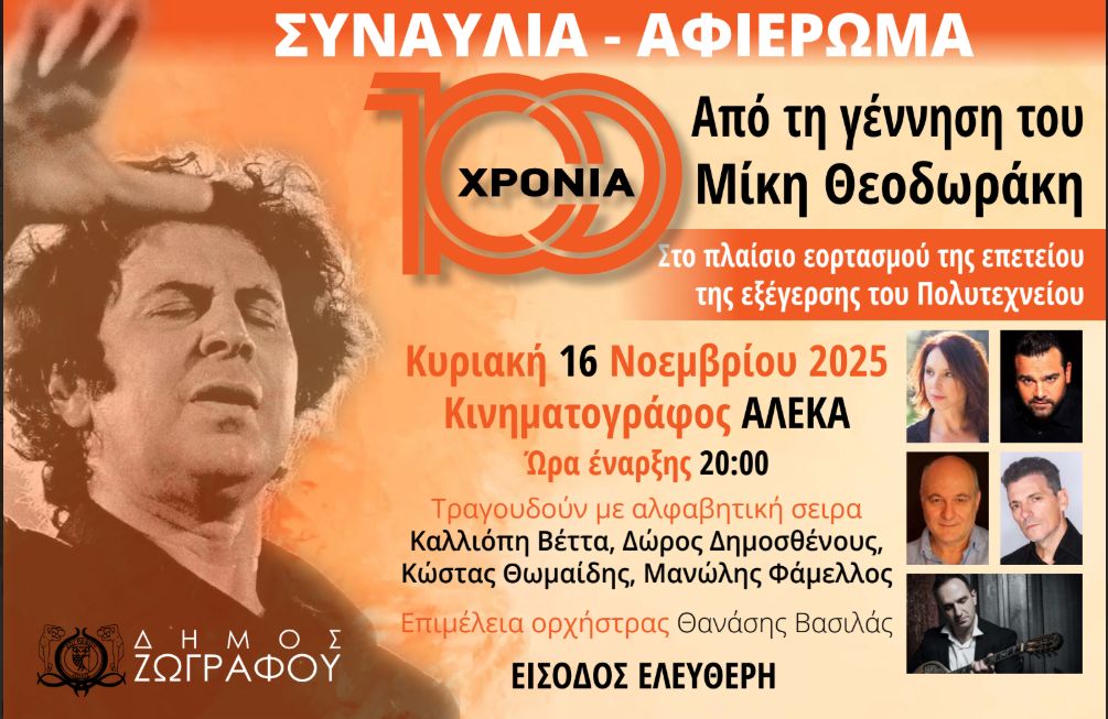 Μία ιδιαίτερα μοναδική συναυλία διοργανώνει ο Δήμος Ζωγράφου, με αφορμή την επέτειο της Εξέγερσης του Πολυτεχνείου καθώς και τα 100 χρόνια από τη γέννηση του Μίκη Θεοδωράκη, τιμώντας τον μεγάλο Έλληνα δημιουργό που σφράγισε με το έργο και τη στάση ζωής του τη νεότερη ελληνική ιστορία· ένα ξεχωριστό αφιέρωμα με τίτλο: «100 χρόνια από τη γέννηση του Μίκη Θεοδωράκη».