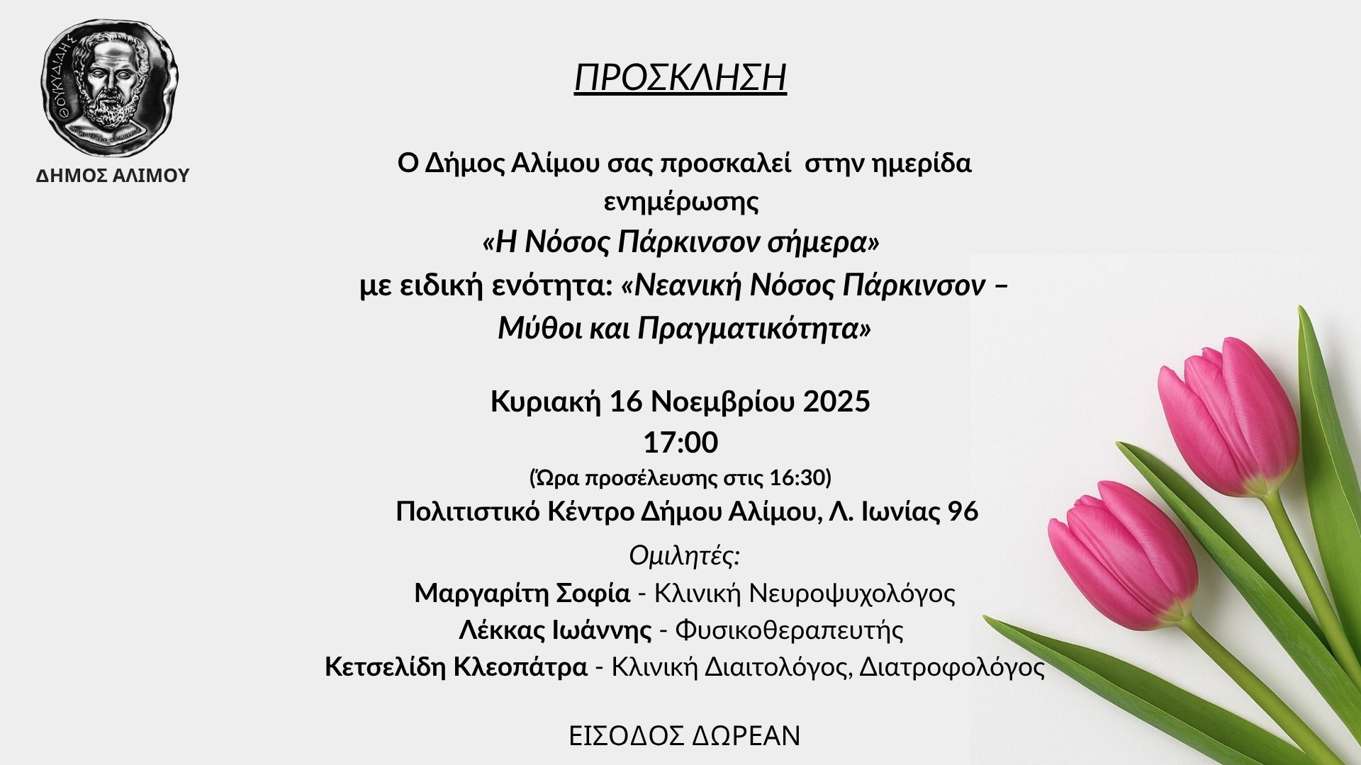 Έτσι, διοργανώνεται στον Άλιμο μια σχετική ημερίδα την Κυριακή 16 Νοεμβρίου, που φιλοδοξεί «να ενώσει και να θυμίσει πως το Πάρκινσον δεν σταματά τη ζωή — απλώς της αλλάζει τον ρυθμό».