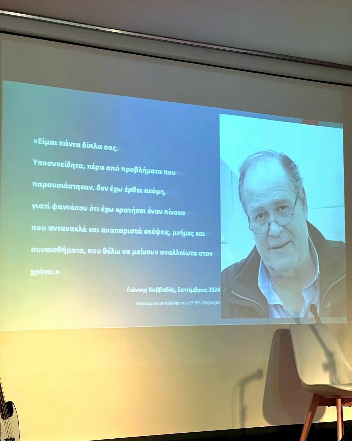Περηφάνια και συγκίνηση κατά την τελετή ονοματοδοσίας της ανακαινισμένης αίθουσας Εκδηλώσεων και Πολιτισμού «Ιωάννης Καββαδάς» στο 2ο Γυμνάσιο – Λύκειο Γλυφάδας, στη μνήμη ενός σπουδαίου Ανθρώπου και εμπνευσμένου Δασκάλου: του τέως Διευθυντή του 2ου ΓΕΛ Ιωάννη Καββαδά.