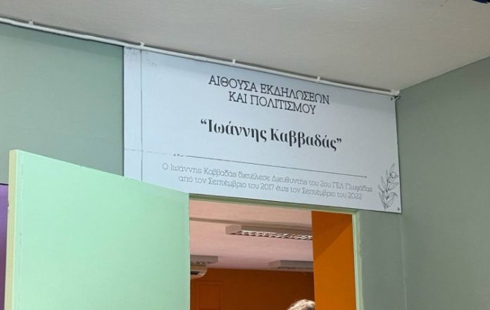 Περηφάνια και συγκίνηση κατά την τελετή ονοματοδοσίας της ανακαινισμένης αίθουσας Εκδηλώσεων και Πολιτισμού «Ιωάννης Καββαδάς» στο 2ο Γυμνάσιο – Λύκειο Γλυφάδας, στη μνήμη ενός σπουδαίου Ανθρώπου και εμπνευσμένου Δασκάλου: του τέως Διευθυντή του 2ου ΓΕΛ Ιωάννη Καββαδά.