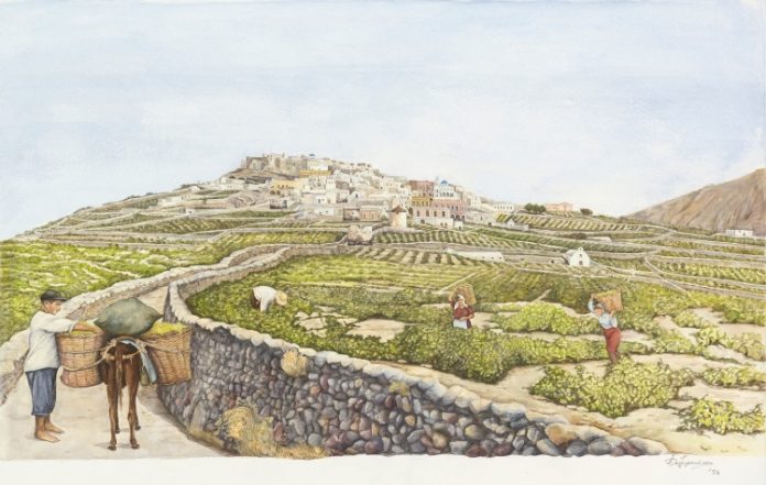 Ορίζοντας ένα νέο βλέμμα στις αθέατες αλλά ενεργές πολιτισμικές καταβολές της Σαντορίνης, η Άρτεμις Χατζηγιαννάκη παρουσιάζει δέκα πέντε νέα έργα (όλα υδατογραφίες) αρμολογημένα σε ένα ιστορικό αφήγημα μέσα από τους τελετουργικούς κύκλους της παράδοσης, των κύκλων εργασίας, της τοπικής οικονομίας, των εθίμων και του συλλογικού θυμικού. Ο επισκέπτης θα αναγνωρίσει πτυχές μιας Σαντορίνης που επιβιώνει όχι μόνο στη μνήμη και στην προφορική μαρτυρία, αλλά και στο ανάγλυφο του τοπίου, στην αρχαία γη, στην γραμμή του ορίζοντα, στην παράδοση της αμπέλου και του οίνου, στα γεωργικά προϊόντα, στη χλωρίδα και στους κύκλους του χρόνου, στην αρχιτεκτονική, που διατρέχει τη στερεότυπη εικόνα της Σαντορίνης μέσα από εκλάμψεις αυθεντικότητας και αρχέγονης σοφίας.