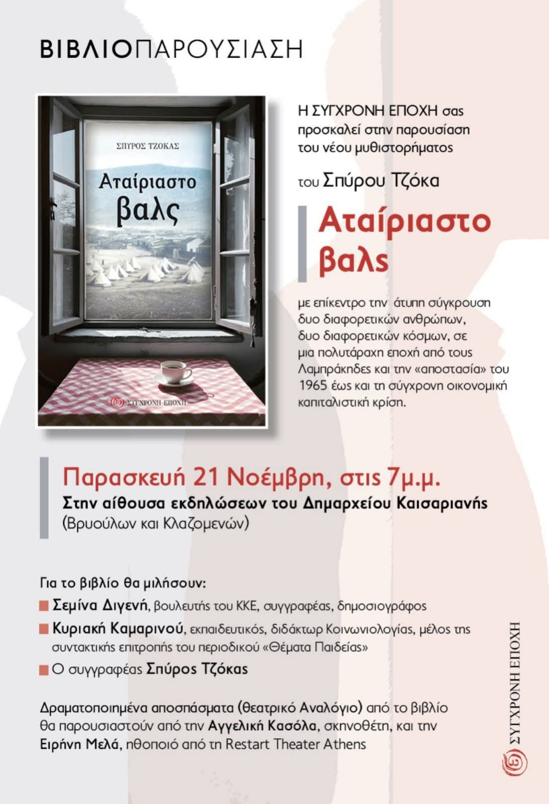 Την Παρασκευή 21 Νοεμβρίου και ώρα 19:00, στην αίθουσα εκδηλώσεων του Δημαρχείου Καισαριανής, θα πραγματοποιηθεί η παρουσίαση του νέου μυθιστορήματος του πανεπιστημιακού – συγγραφέα και πρώην δήμαρχου Καισαριανής Σπύρου Τζόκα, με τίτλο «Αταίριαστο βαλς».