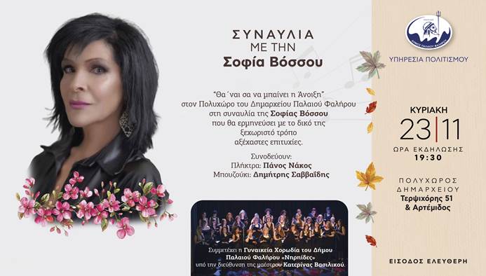Το χειμερινό πρόγραμμα τέχνης και πολιτισμού του Παλαιού Φαλήρου ξεκινάει την Κυριακή 23 Νοεμβρίου, με τον Δήμο να υποδέχεται στο Δημαρχείο της πόλης μια από τις αγαπημένες και εμβληματικές φωνές του ελληνικού τραγουδιού, τη Σοφία Βόσσου, που θα ερμηνεύσει γνωστές επιτυχίες.