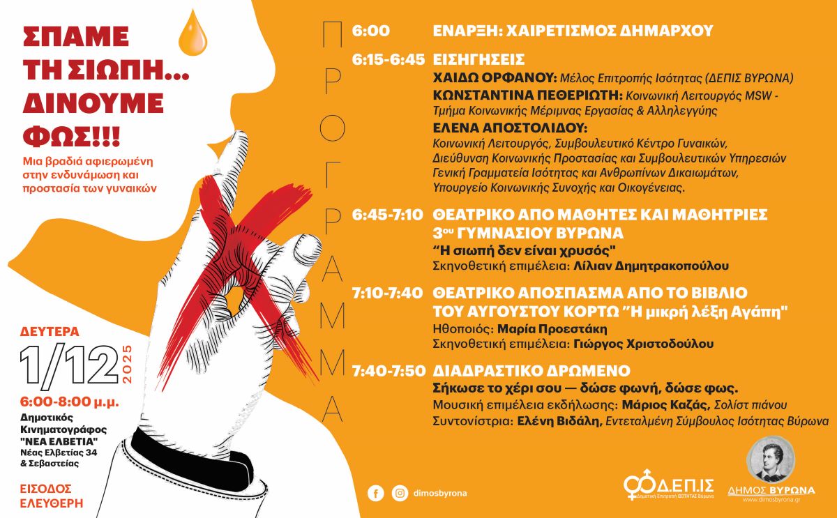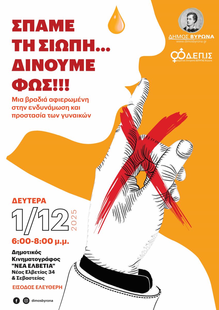 Η εκδήλωση θα λάβει χώρο τη Δευτέρα 1 Δεκεμβρίου 2025 και ώρα 18:00, στον Δημοτικό Κινηματογράφο «Νέα Ελβετία» και στοχεύει στην ενημέρωση, την κοινωνική ευαισθητοποίηση και στην ανάδειξη του μηνύματος σε θέματα κακοποίησης «Σπάμε τη Σιωπή -Δίνουμε ΦΩΣ!».