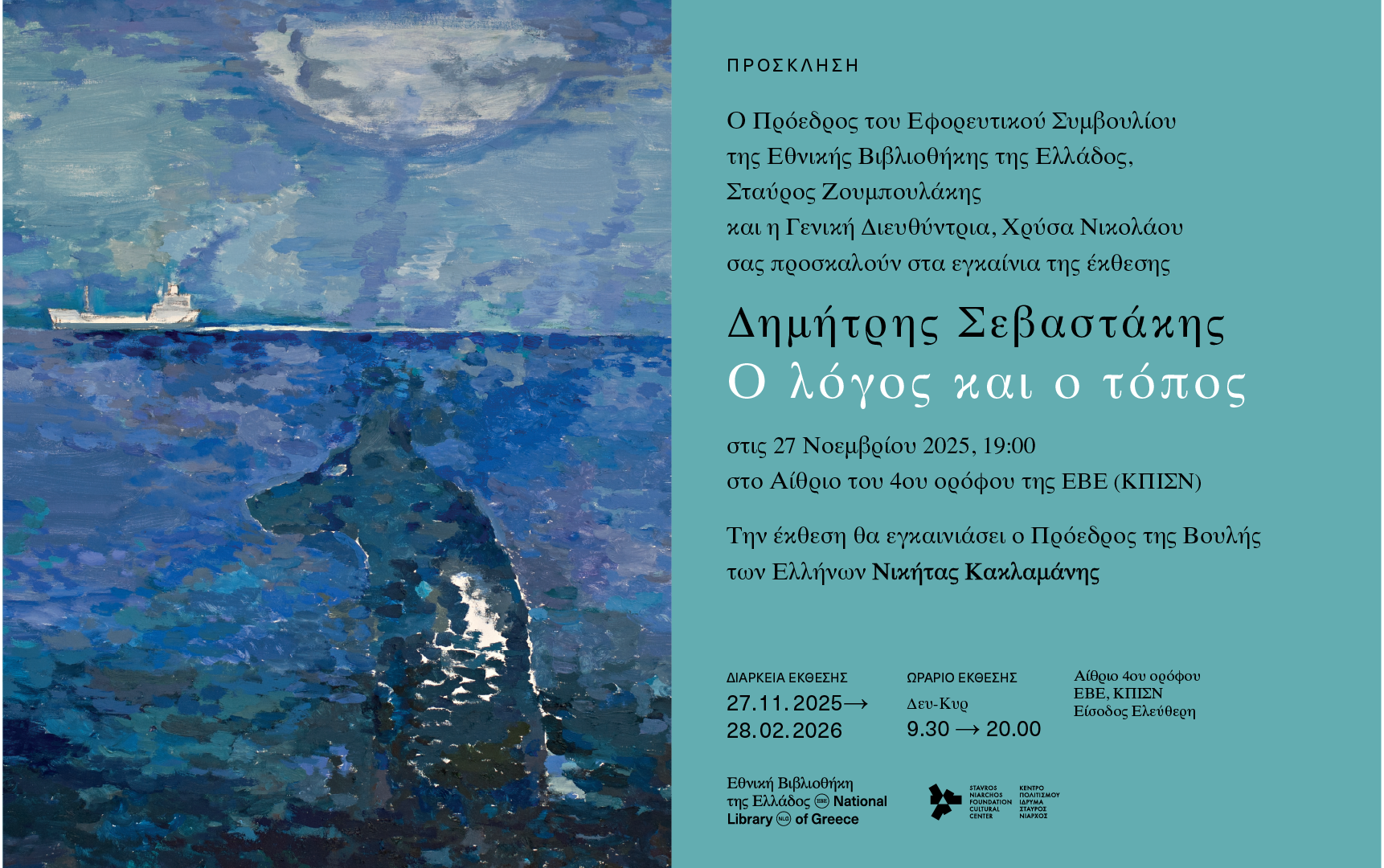 Η έκθεση του Δημήτρη Σεβαστάκη, με τίτλο «Ο λόγος και ο τόπος» περιλαμβάνει περισσότερα από διακόσια έργα του, που φιλοτεχνήθηκαν την τελευταία δεκαετία και εκτίθενται για πρώτη φορά στην Εθνική Βιβλιοθήκη της Ελλάδος, με ελεύθερη είσοδο.
